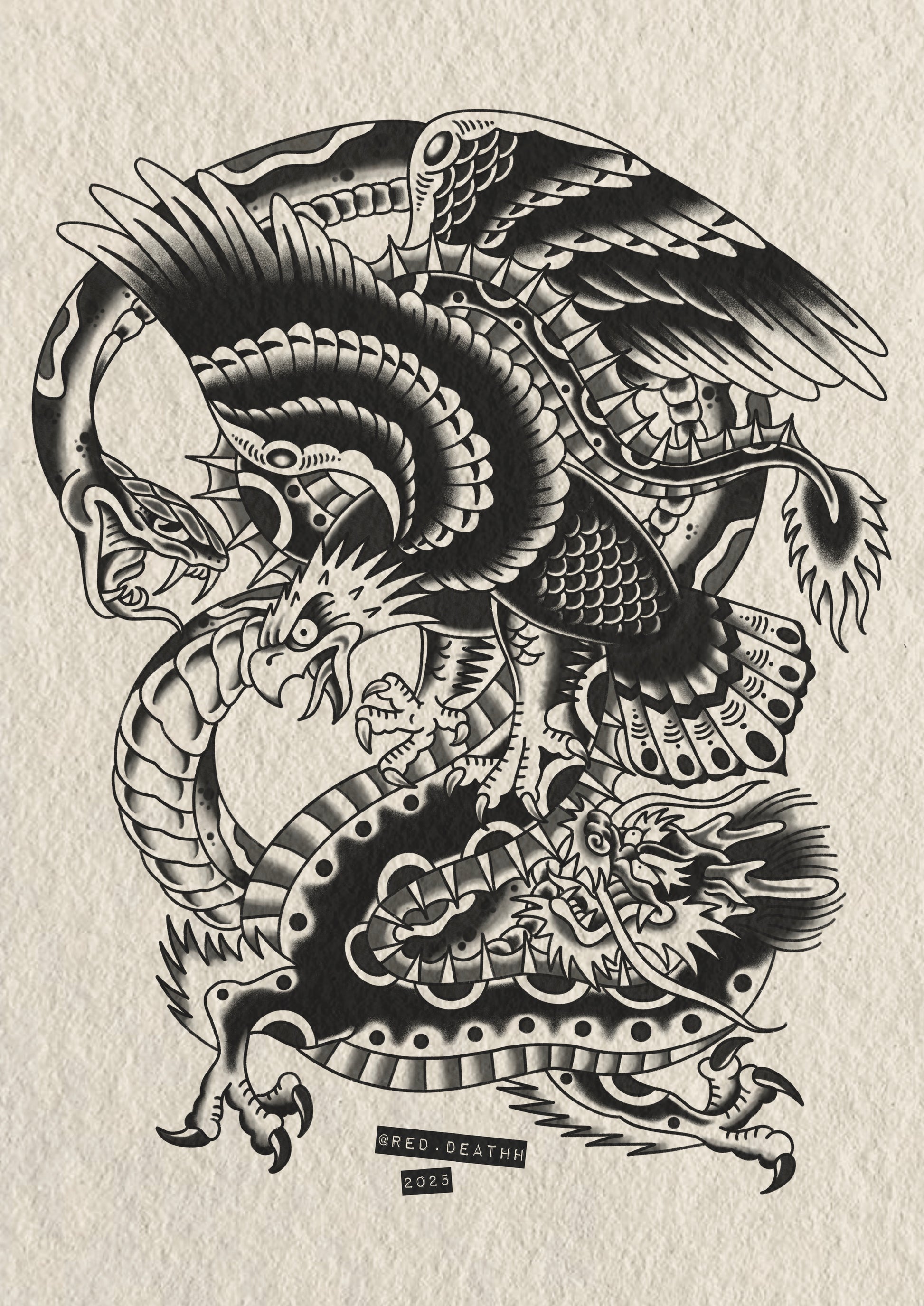 High-quality reproduction of my take on the legendary battle royale design - an eagle, snake & dragon locked in combat.