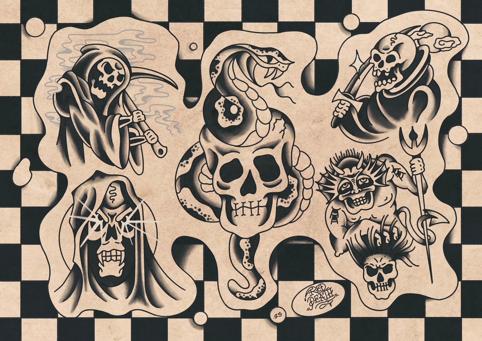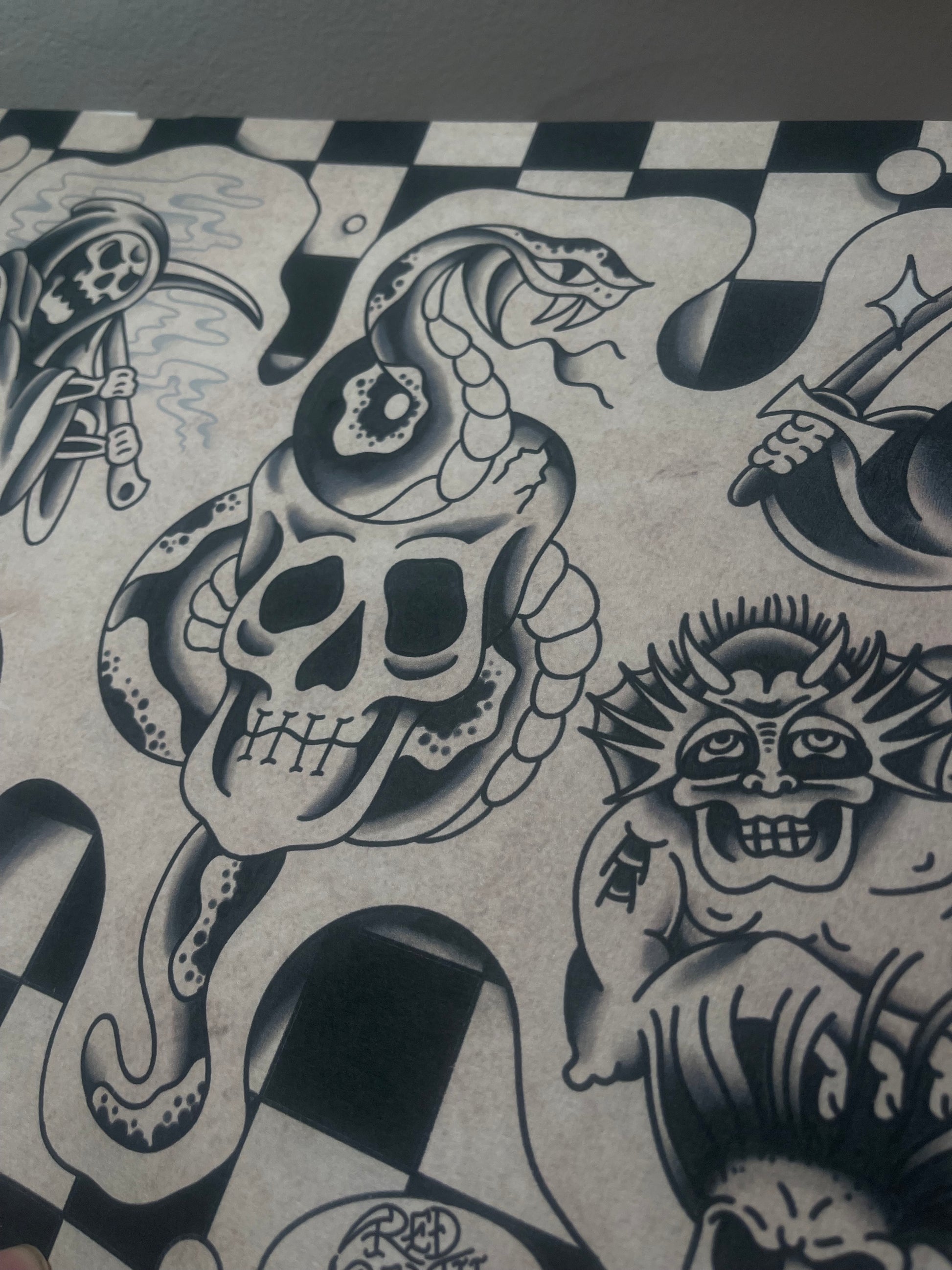 High Quaility print of this tattoo flash sheet, featuring classic tattoo motifs as pictured, skulls, grim reapers, snakes, demons - all the good things.