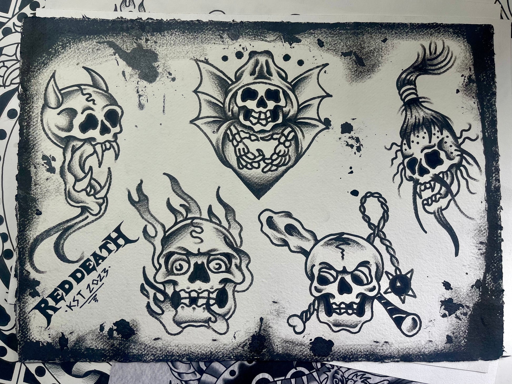 Skulls - A3 Original Tattoo Flash Sheet